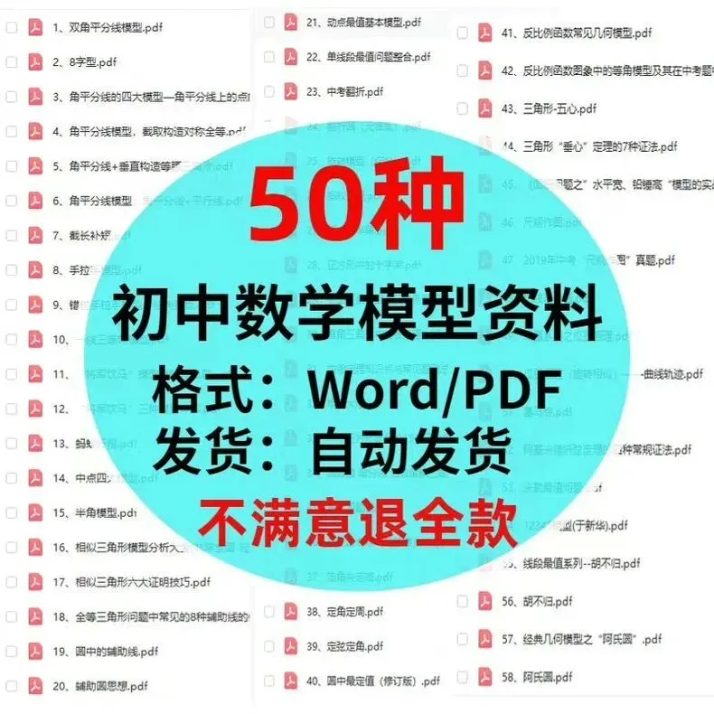 各位家长和同学们,为了帮助大家更好地复习初中数学,我们整理了50种初中数学模型资料,包含Word和PDF格式,方便大家下载打印。