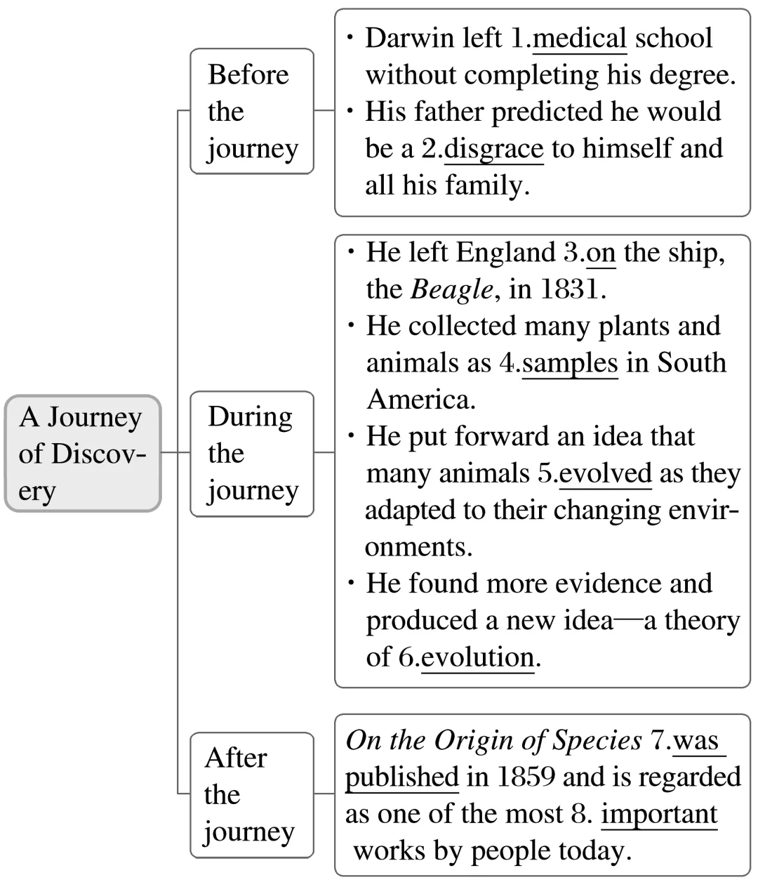 Charles Darwin was a geologist and naturalist,1.fascinated(fascinate) by rocks,plants and animals.He left England on the ship,the Beagle,in 1831.The journey gave him the chance 2.to study(study) various living things in their natural environments.He noticed that some species of animals were very similar 3.to each other.
