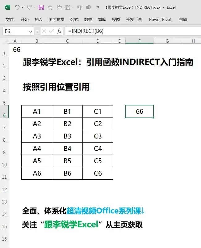 简单解释一下这块,首先引用B6的引用位置,由于B6=A1,所以按照A1单元格的值返回66,这个示例展示了INDIRECT函数非常灵活的特性,基于此才有众多的扩展用法。