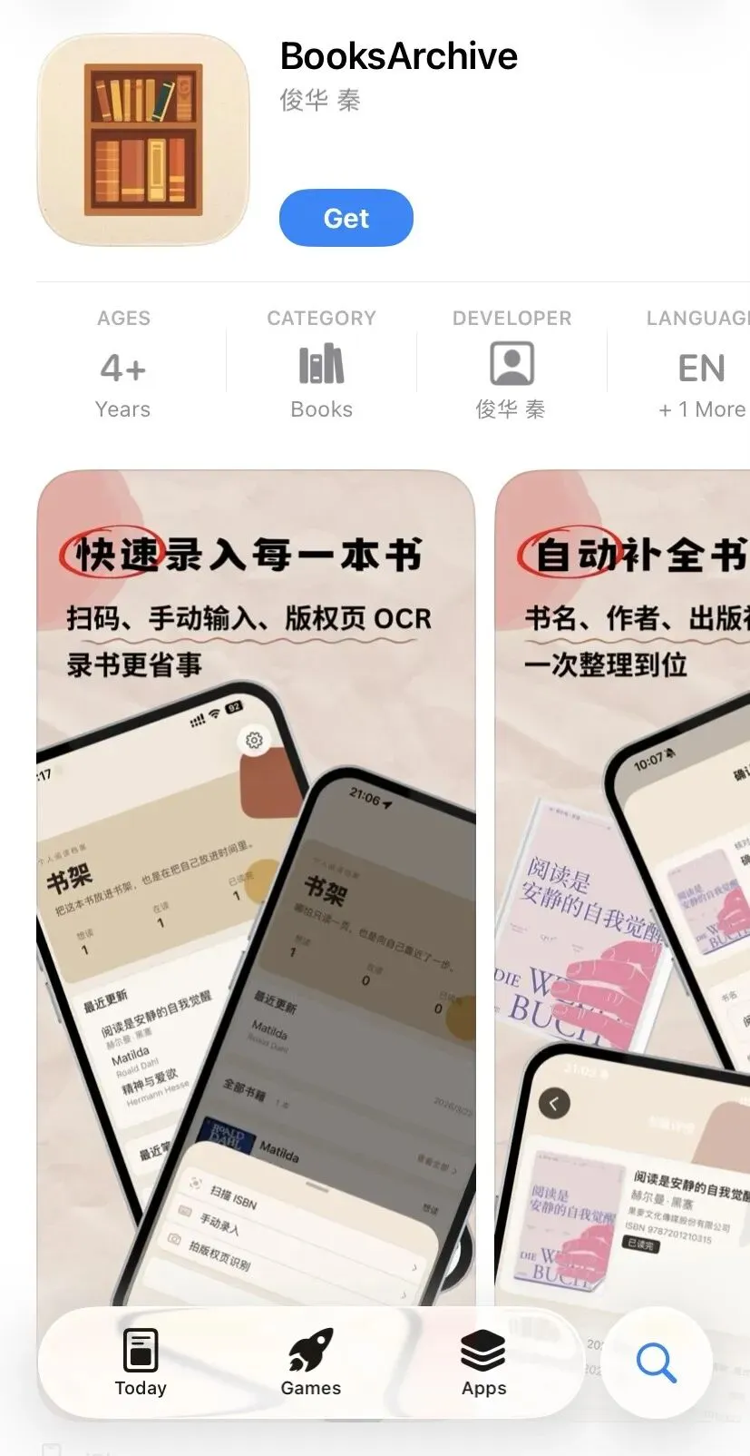 他开发的是一个记录纸质书阅读情况的程序,名叫“Booksarchive”,来源于他对纸质书阅读的爱好。