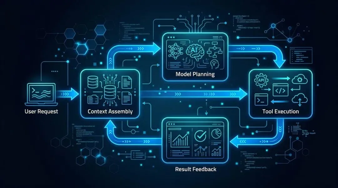 用户目标 → 模型规划 → 工具执行 → 结果反馈 → 再规划