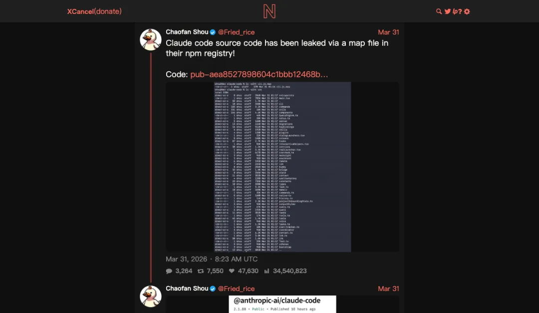 3月31日 凌晨 4:23 AM ET — 安全研究员 Chaofan Shou(@Fried_rice,Solayer Labs 的实习生)在 X 上率先发出来,展示了怎么从 npm 包里提取完整源码。这条帖子最终超过 3400 万次浏览。