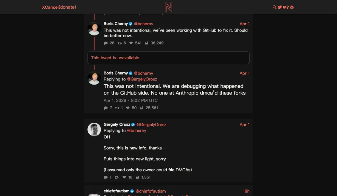 4月1日 晚 — Claude Code 负责人 Boris Cherny 公开承认出错,撤回大部分 DMCA 通知,最终只保留对 1 个仓库及其 96 个 fork 的下架请求。