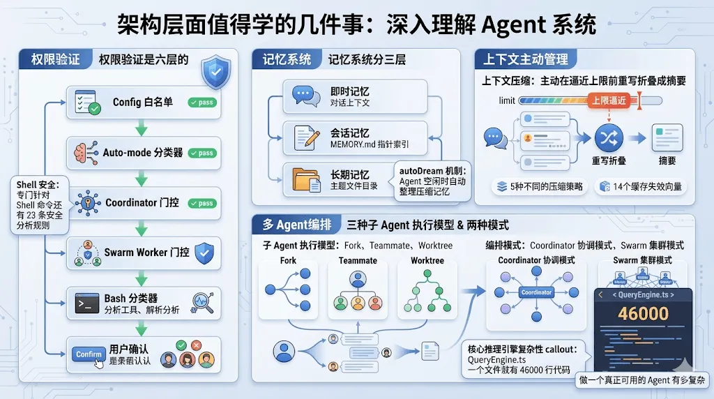 专门针对 Shell 命令还有 23 条安全分析规则。权限这块在很多自制 Agent 项目里基本是摆设,这套设计可以直接拿来参考。