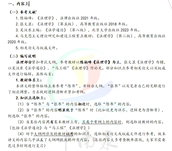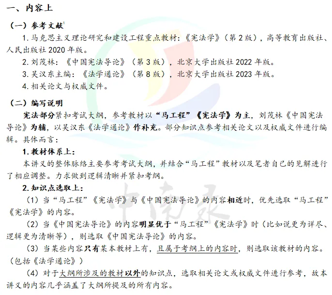 中南录的讲义一是覆盖了考纲要求的考试内容,并结合过往真题趋势对一些超纲考点进行整理。无论是法理部分的“陈书”与“张书”,还是X法部分的“中宪导”与“马工程”,核心内容均进行了整合。因此,只要考试参考教材不变,学员们手握中南录讲义均能从容应对。