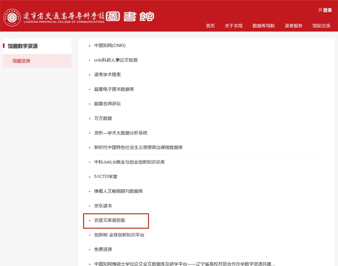 ②“馆藏资源”→“百度文库高校版”