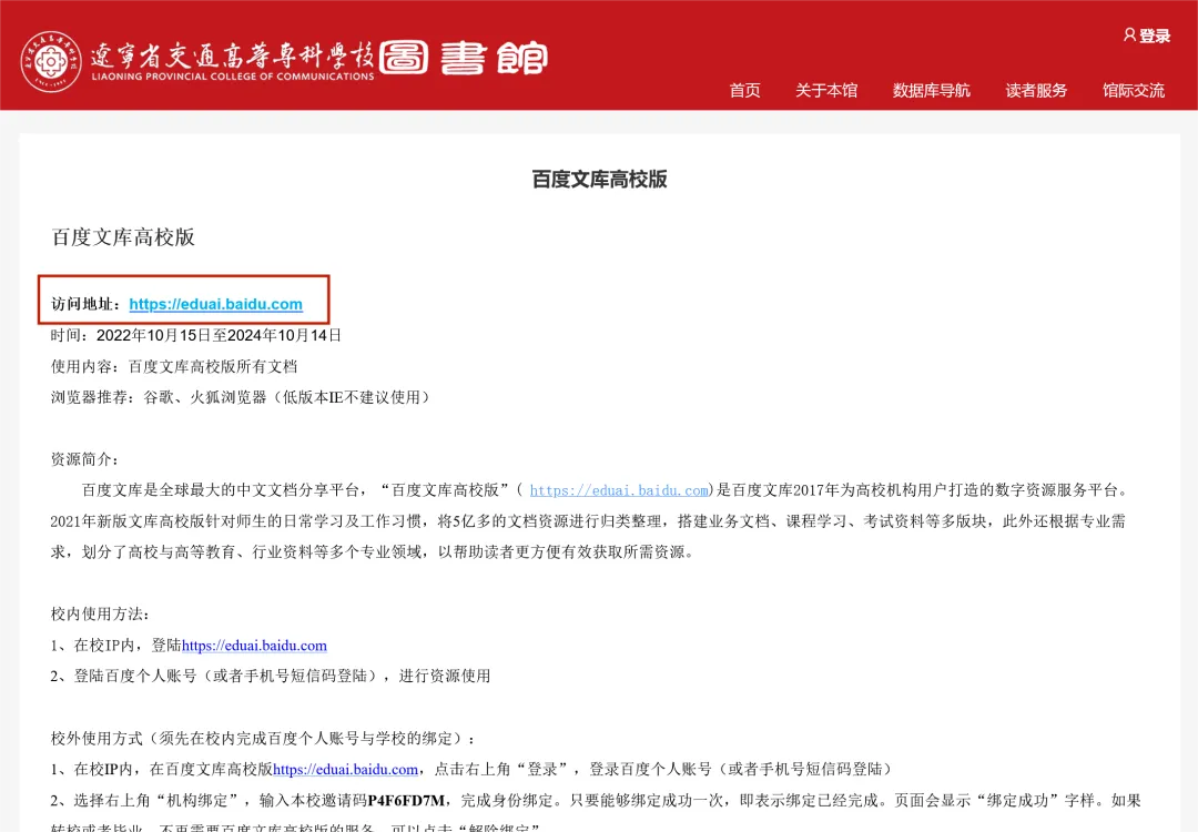 从我校图书馆官网进入,首页“馆藏数字资源”处点击“更多”,列表中寻找资源“百度文库高校版”,点击进入,点击访问地址“https://eduai.baidu.com”。