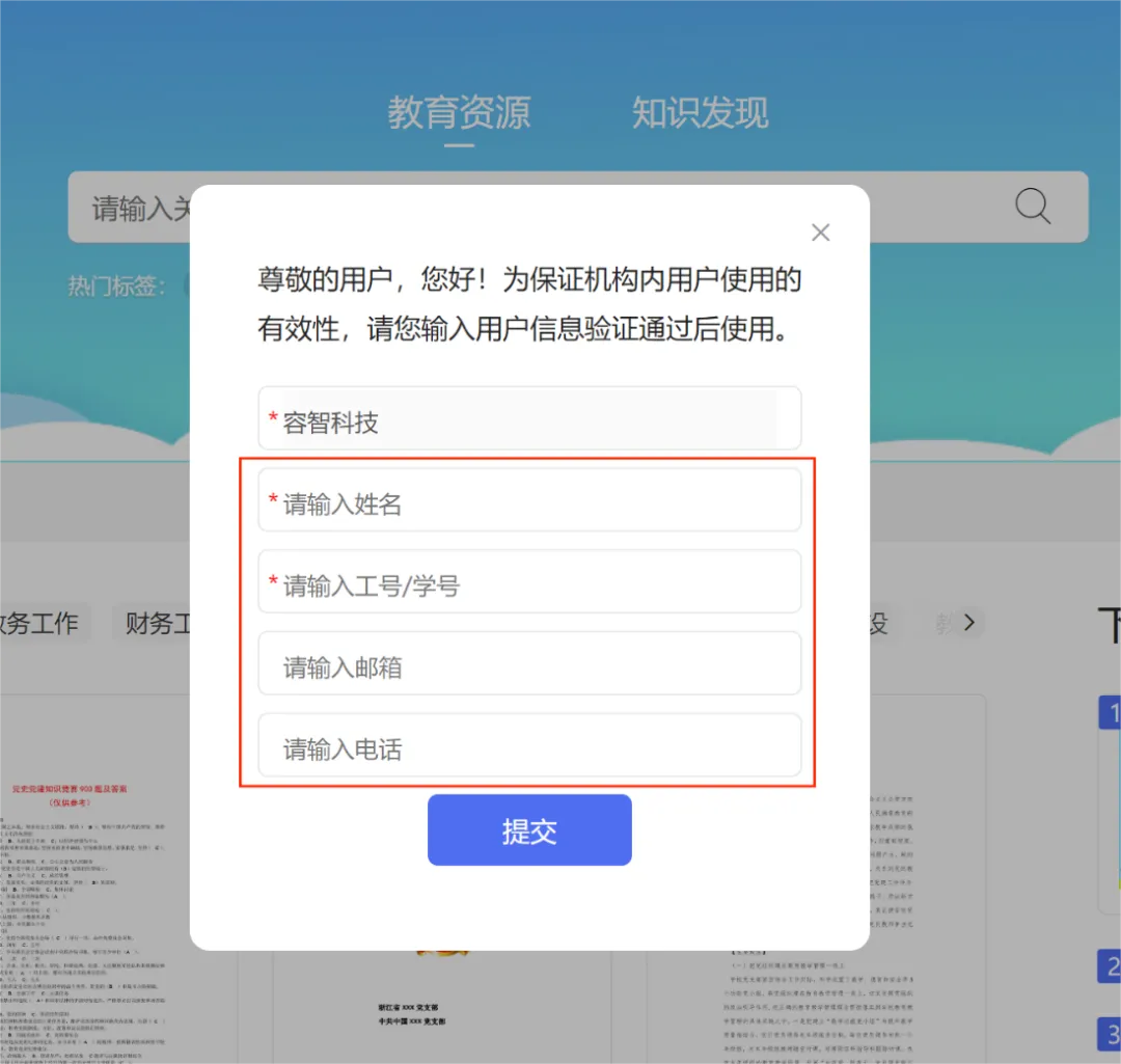 步骤二:在弹出框内,输入您的准确信息,包括姓名、工号或者学号、邮箱、电话等信息,方便管理员老师进行信息核实确认,是否是本单位的读者,决定了是否会被通过审批,获取使用权限。