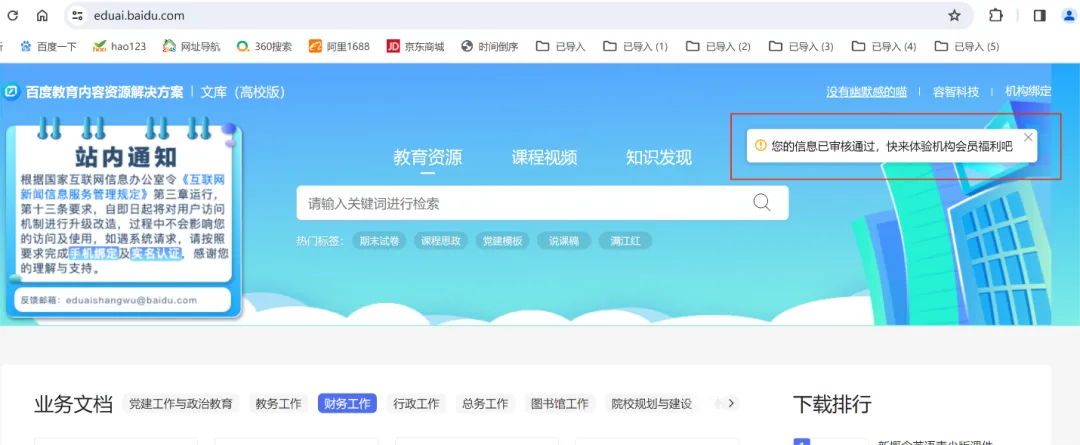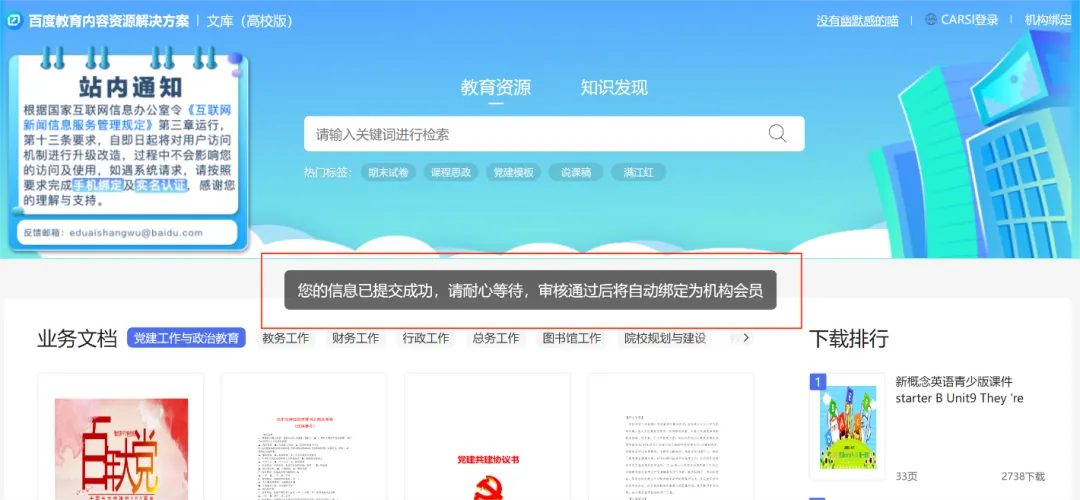 说明:审核通过后,即可在百度文库高校版https://eduai.baidu.com上享有下载权益。建议非必要情况下,不要随意解绑,解绑之后还需要再次进行申请审批,将会影响使用。