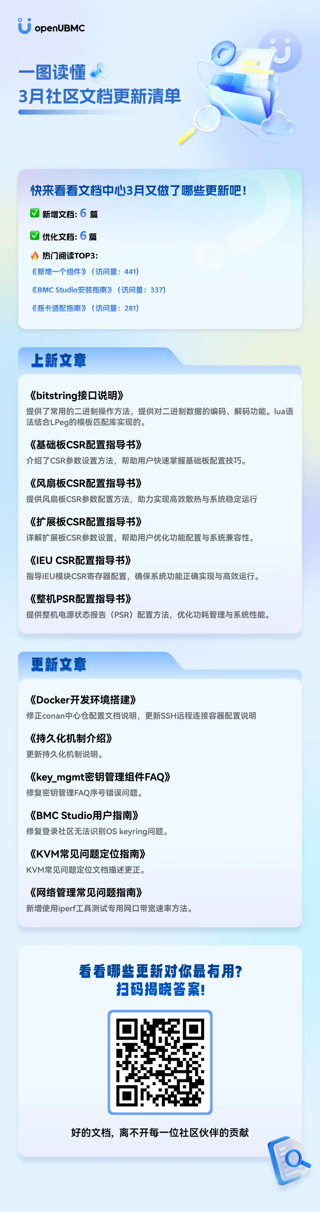 一图读懂|openUBMC 3月社区文档更新清单 欢迎关注openUBMC 社区官网:https://www.openubmc.cn 代码仓地址:https://gitcode.com/openUBMC