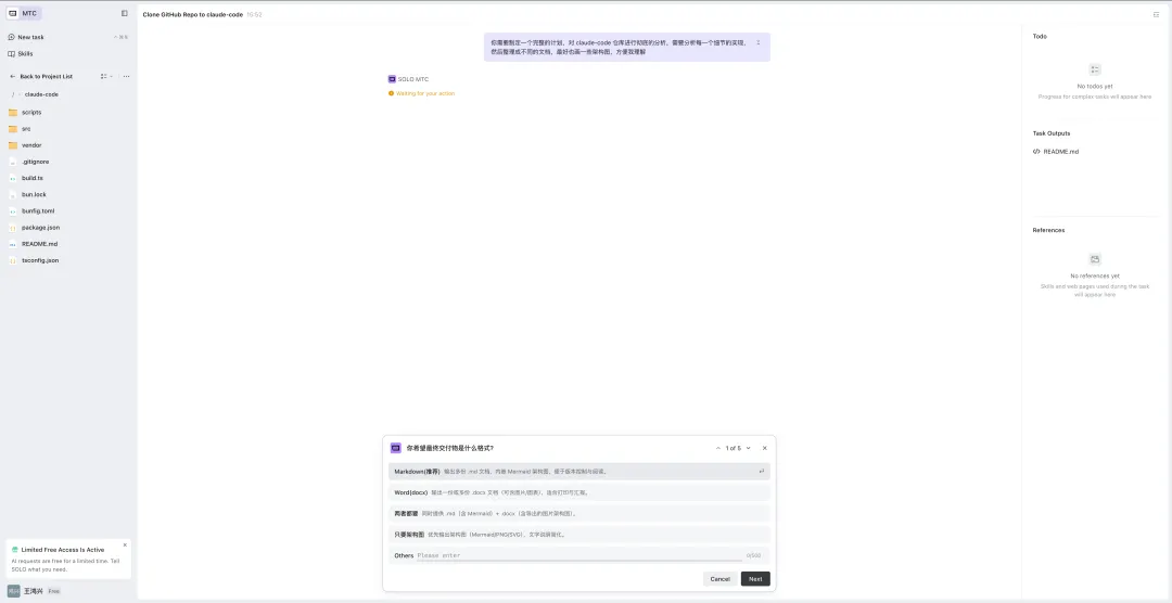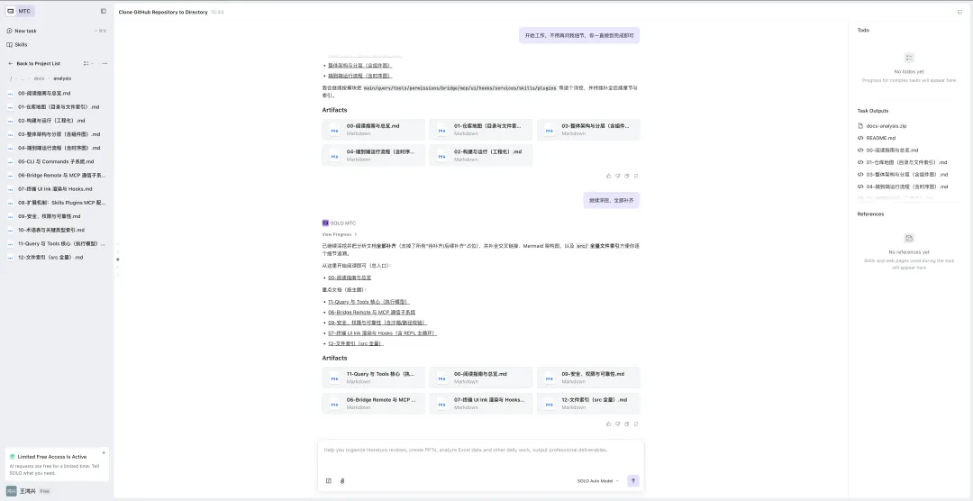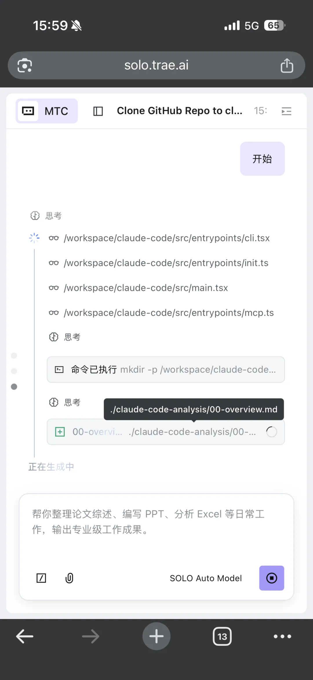这里特别说明:Claude Code 是一款很棒的产品,有非常多值得学习的地方。本次只从「开源代码解读」这个场景为大家演示如何操作,以后遇到感兴趣的开源项目,你们也可以和 SOLO 一起更高效地分析和学习。