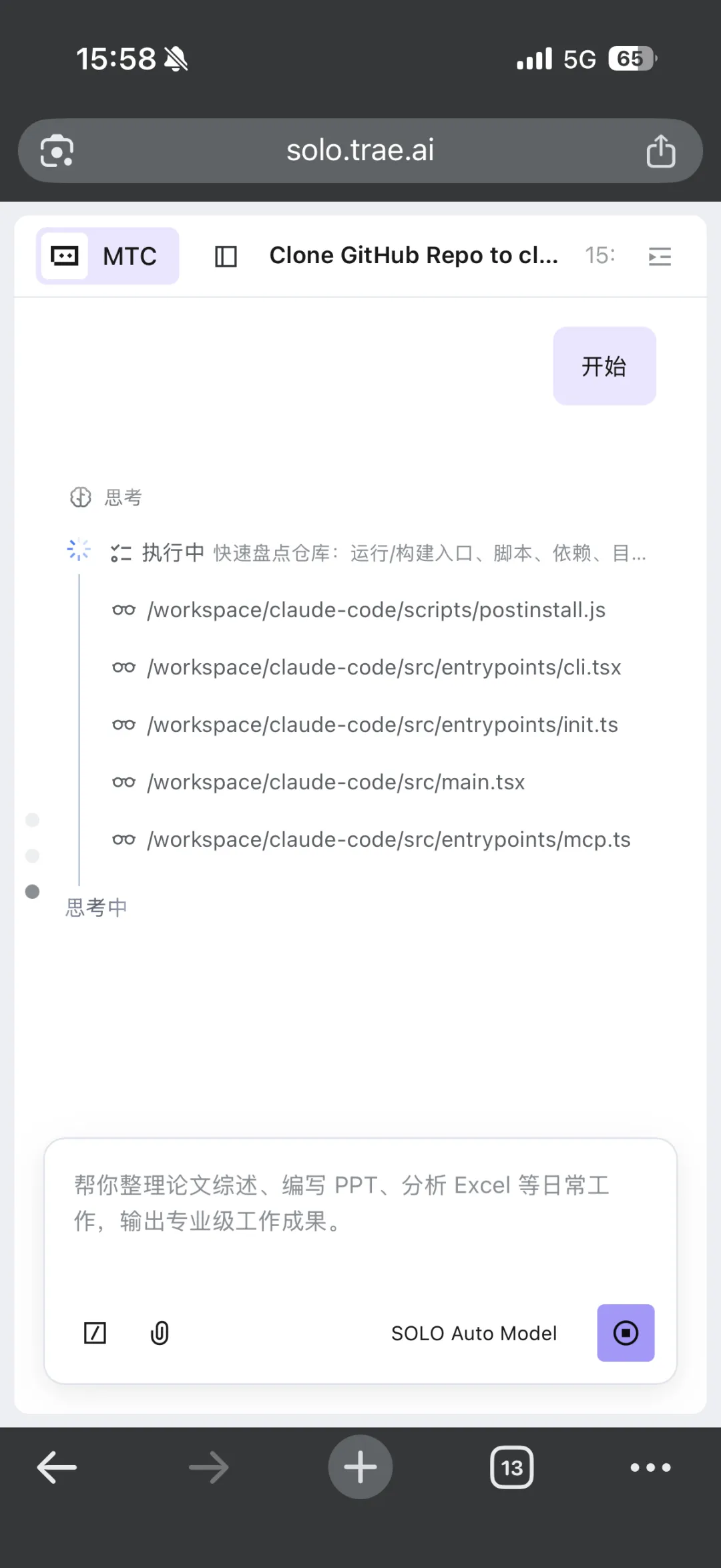 打开 SOLO Web ,因为 MTC 模式很适合做这些分析,所以我们本次选择使用 MTC 模式来进行分析,先将项目拷贝下来,只需要跟 AI 说: