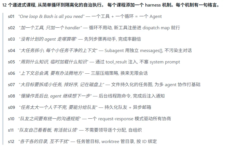 这个项目是一个从 0 到 1 拆解 Claude Code 思路的教学型仓库。它把 Agent 的核心能力拆成了 12 个渐进式模块,比如工具调用、任务规划、子 Agent、Skill加载、上下文压缩等。