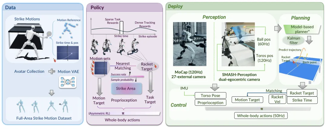 📖 SMASH系统为人形机器人打乒乓球提供了完整的解决方案。它首先通过运动VAE模型增强和扩展了稀缺的动作捕捉数据,生成了覆盖广泛击打工作空间的全身击球运动库。然后,通过任务导向的运动匹配机制,将任务目标(击球点、速度、时间)与运动先验紧密结合,训练一个全身强化学习策略。该系统还构建了基于机载视觉的实时感知管道(YOLO+HSV+AEKF),实现了对球和自身体态的稳定估计。真实世界实验验证了SMASH在仅使用机载摄像头的情况下,能够执行包括爆裂扣杀和低姿救球在内的多样化全身击球动作,并首次实现了户外连续对打。