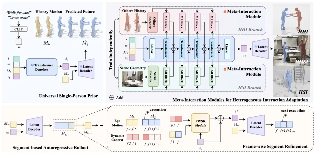 💡 将通用运动知识与特定交互能力分离,是实现数据高效、可扩展且实时响应的交互行为生成的关键。