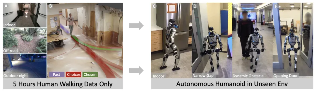 ✨ 仅用5小时人类行走数据训练扩散先验,零样本部署到人形机器人,涌现出避障、等待开门等智能行为