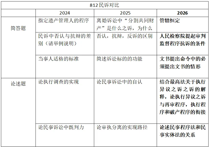 结合2026年民诉考研命题情况来看,简答题命题延续“重者恒重”的规律,同时呈现出深入细致的新趋势——例如“管辖恒定”作为管辖模块的二星考点,仍是考察重点,而“必须提出文书的情形”这类以往易被忽略的细致知识点,也逐渐成为命题热点。论述题则保持一贯风格,呈现“基础知识拓展题+民事执行类题”的组合模式,既考察基础功底,也侧重综合应用能力。