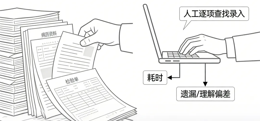 在临床研究及医疗数据管理过程中,大量关键信息仍然以纸质或扫描文档的形式存在,例如检查报告、病历资料、检验单据等。这些文档虽然承载了完整的信息,但由于无法被系统直接识别和使用,往往需要依赖人工进行整理与录入。