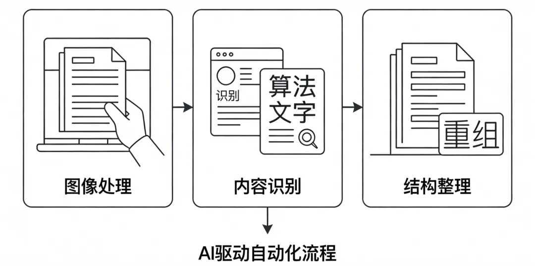 随着AI图像算法在文档处理中的逐步应用,原本分散在各个环节的人工操作,正在被逐步串联成一套自动化流程。系统会把原本分散的处理步骤串起来,比如先做图像处理,再做内容识别,最后进行结构整理,让整个流程可以自动跑通,而不是依赖人工一段一段处理。