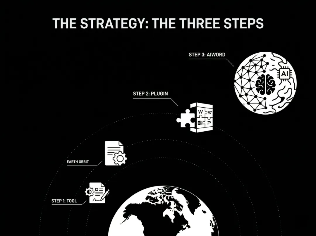要做 AI 原生文档编辑器,必须自主打造其 AI Native 内核。 但我们团队只有三个人,是清北的普通学生,没有任何外部资源。有的只是手里的AI技术和一腔改变世界的热忱。因此只有实现产品开发到用户使用闭环,每一步都给用户带来真实价值,才能继续推动事业。因此分三步走: