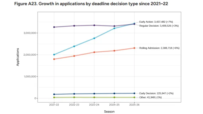 在申请通道的选择上,Early Action(EA)凭借不绑定录取、能提前获取录取结果的优势,再加上大量TOP30-50院校开放该通道,成为申请者的“低风险优先级”选择,申请量同比增长7%,达343.7万份,不仅参与人数最多,扩张速度也领先于其他申请通道。
