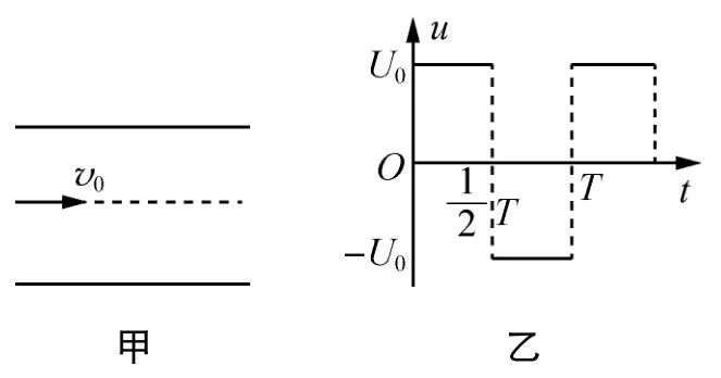 1. 图甲为两水平金属板,在两板间加上周期为T的交变电压u,电压u随时间t变化的图线如图乙所示.质量为m、重力不计的带电粒子以初速度v0沿中线射入两板间,经时间T从两板间飞出.下列关于粒子运动的描述错误的是( )