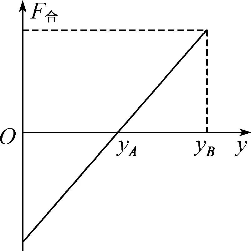 【解析】 带电小物块放在A点时,物块恰好静止,故物体在A点受到电场力方向垂直金属板,受到的最大静摩擦力等于物体的重力,即qEA=FNA,mg=μFNA;将该物块由原点O静止释放,根据题意可知,O点电场强度小于A点,故物体在O点受到的最大静摩擦力小于重力,物块向下运动,由于电场强度E=E0+ky,故随物块下滑,滑动摩擦力在逐渐增大;进一步分析可知,物块从O到A过程,合力向下,随下滑距离的增大,合力均匀减小到0,做加速运动;在A点速度达到最大,从A点继续下滑过程,合力方向变为向上,随下滑距离的增大,合力从0开始均匀增大,向下做减速运动,直至速度减为0.物块下滑全过程电场力均不做功,摩擦力一直做负功,重力一直做正功,机械能不守恒,A、B错误;根据分析可作出物块下滑时受到的合力随下滑位移的关系,如图所示,由于OA=AB,故物块刚好在B点停下,由于物块在B点受到的电场力大于在A点受到的电场力,故物块在B点停止后,由于最大静摩擦力大于重力,故物块停止运动后受静摩擦力作用,大小等于重力,处于平衡状态,物块不再上滑,也不下滑,D正确,C错误.