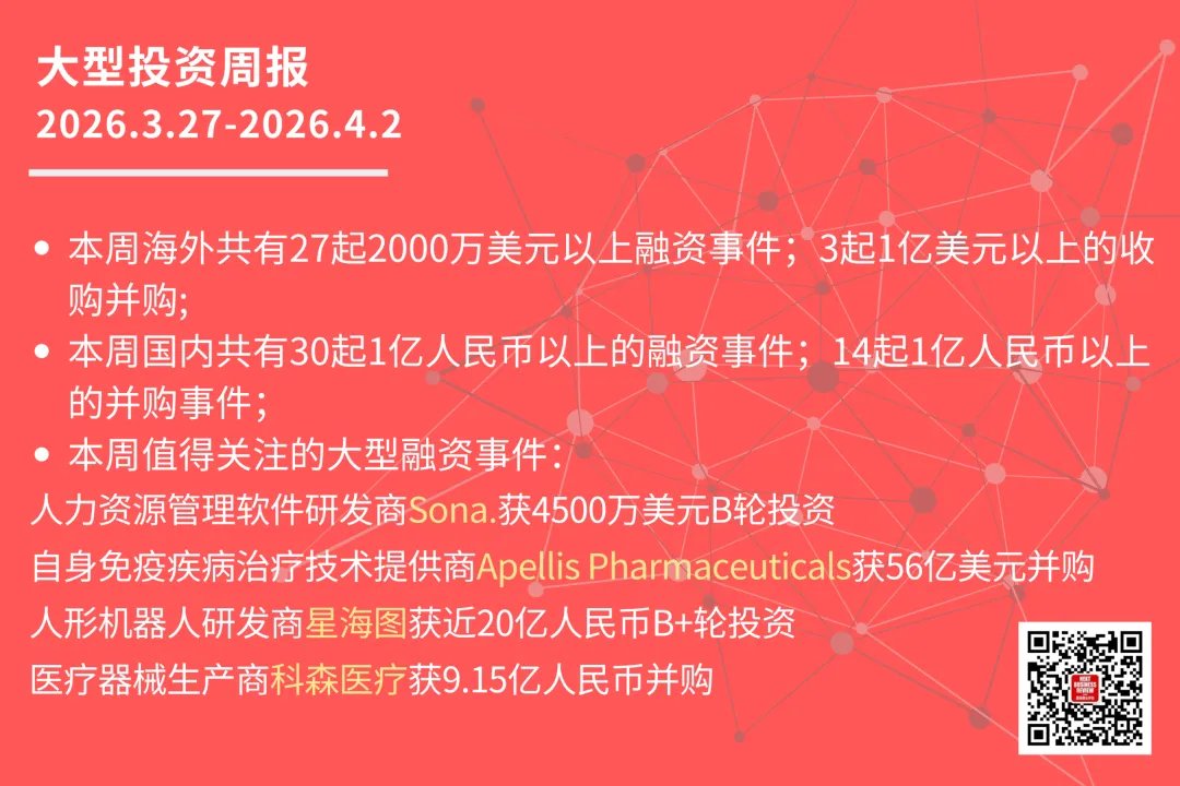 大型投资周报:人力资源管理软件研发商Sona.获4500万美元B轮投资;自身免疫疾病治疗技术提供商Apellis Pharmaceuticals获56亿美元并购