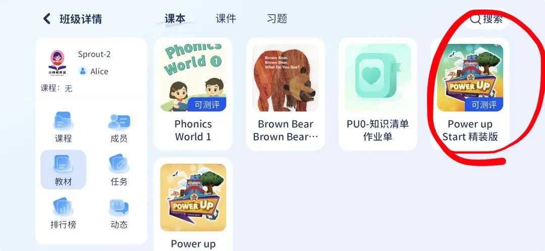 进入班级页面后,点击左侧的「教材」,即可显示该班级涉及的全部教材,点击选中对应教材。
