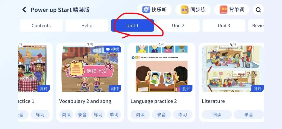 选中教材后,页面上方会显示教材单元,下方会列出对应单元的具体页面;根据老师的指示,点击对应页面,即可选择听读、跟读学习。