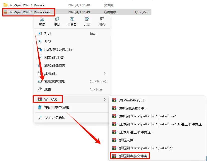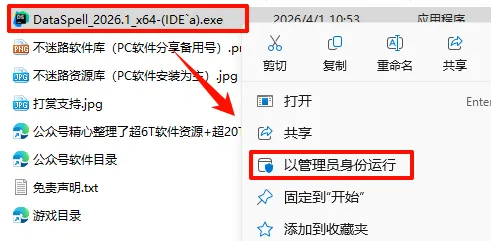 2.打开刚刚解压的文件夹,鼠标右键点击“DataSpell_2026.1_x64-(IDE`a).exe”选择“以管理员身份运行”