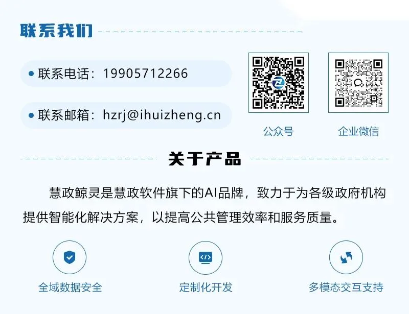 慧政软件是国家高新技术企业,国家涉密信息系统集成单位,杭州市保密协会会员,浙江专精特新企业,通过国际CIMM5软件成熟度认证企业,连续三年荣获浙江省数据开放创新大赛一、二、三等奖奖项。企业以”数字驱动变革,软件创造价值”为理念,专注于为政府及公共部门提供以数据和智能为核心的数字化解决方案,公司的核心产品慧政鲸灵已在浙江省广泛应用,并拥有全省约30万用户。慧政鲸灵|更懂政企的 AI 智能办公平台慧政鲸灵是慧政软件旗下专注政企智能化应用场景的核心品牌,专为政府、事业单位与高安全需求机构打造。我们把数据安全放在第一位,用 AI 重构政企办公全流程:从政企智能问答、文件智能起草、智能知识库、智能会议、政策研究辅助、决策分析优化、智能协同办公,形成一站式、全闭环的智能解决方案。不用复杂操作,AI 就能帮你写得快、审得准、效率高、更合规,真正实现办公减负、治理提效,让政企工作更智能、更高效、更安全。
