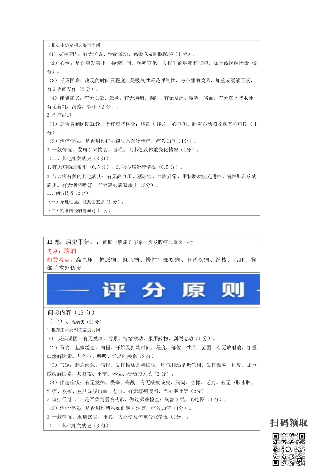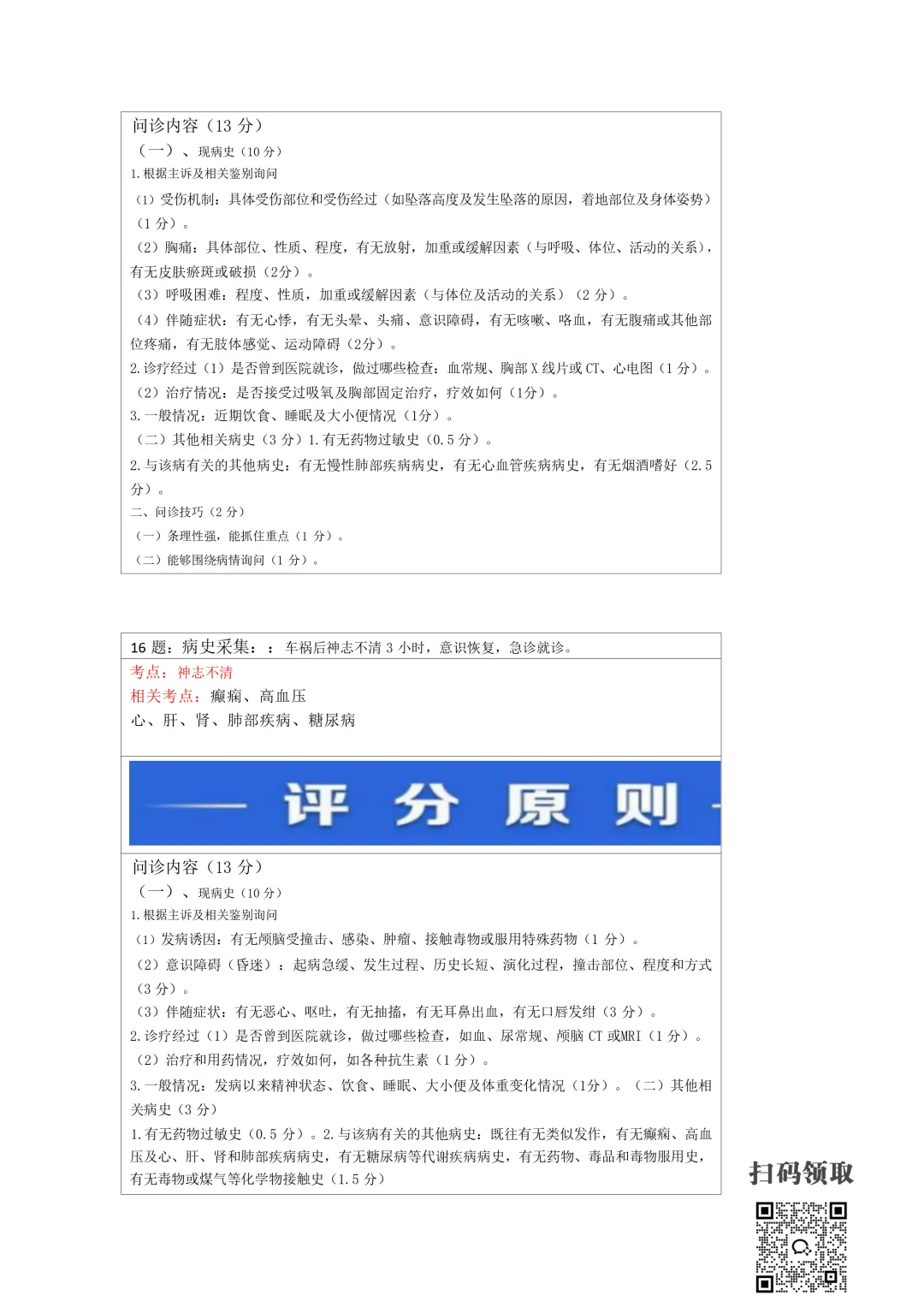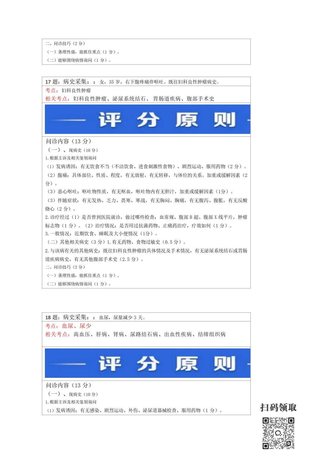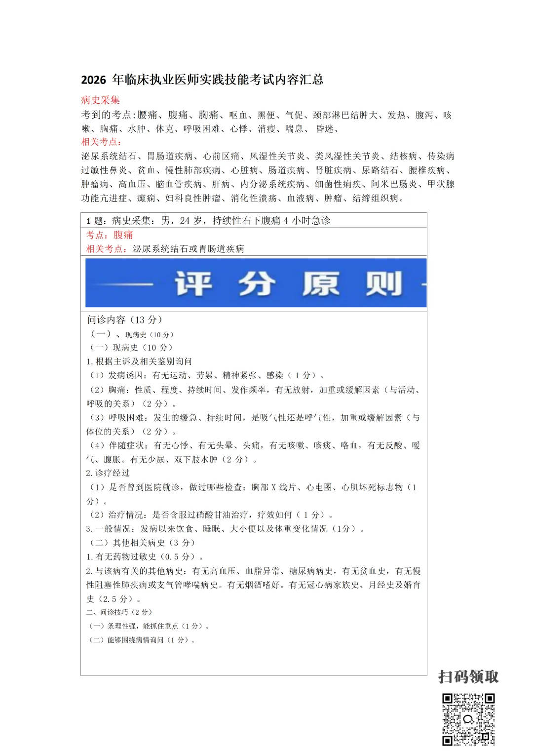 医师考试必备:病史采集万能公式(可打印) 执业医师实践技能考官手册 免费领取 (扫码领取) 病史采集万能公式及评分标准 领取方法 扫码领取 小程序领取 关注本公众号,获取完整版报考指南、考点及备考资料↓↓↓