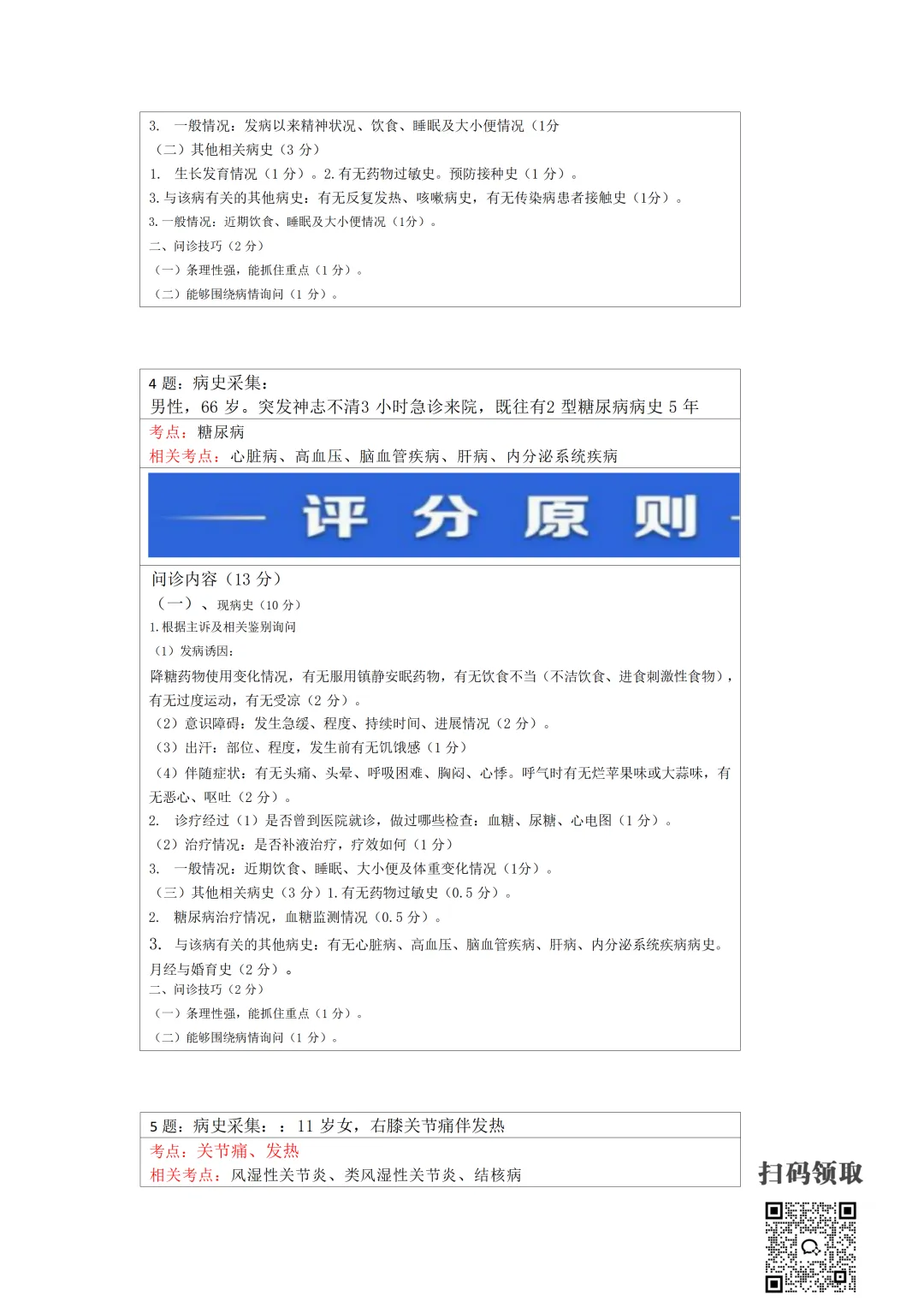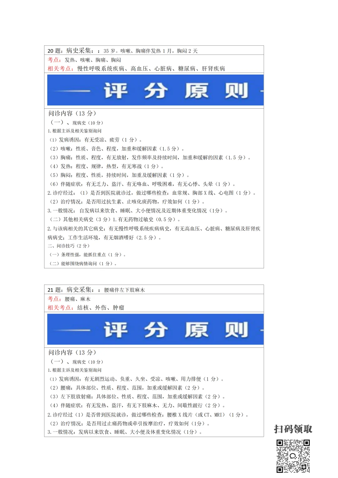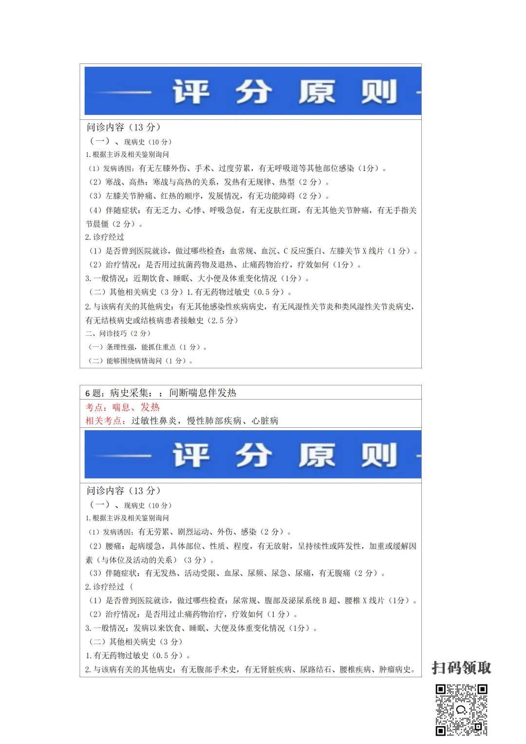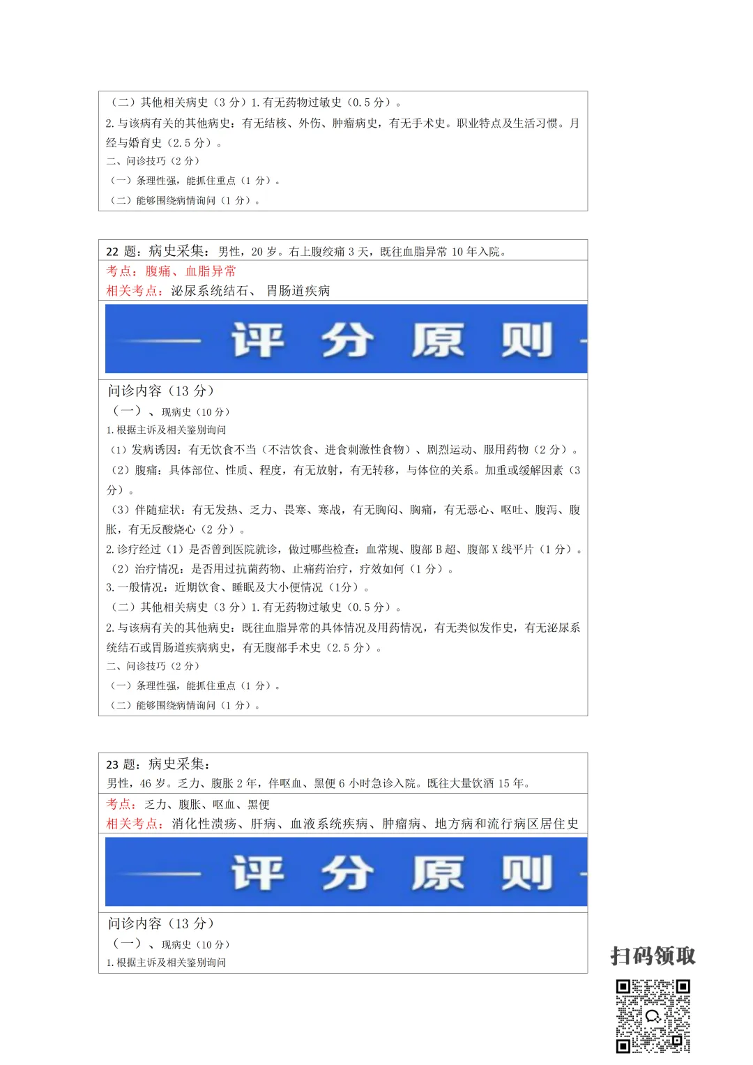 医师考试必备:病史采集万能公式(可打印) 执业医师实践技能考官手册 免费领取 (扫码领取) 病史采集万能公式及评分标准 领取方法 扫码领取 小程序领取 关注本公众号,获取完整版报考指南、考点及备考资料↓↓↓