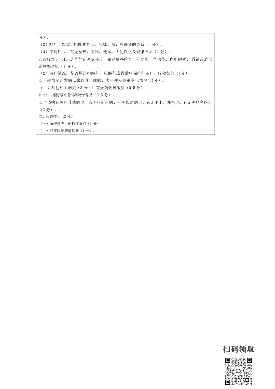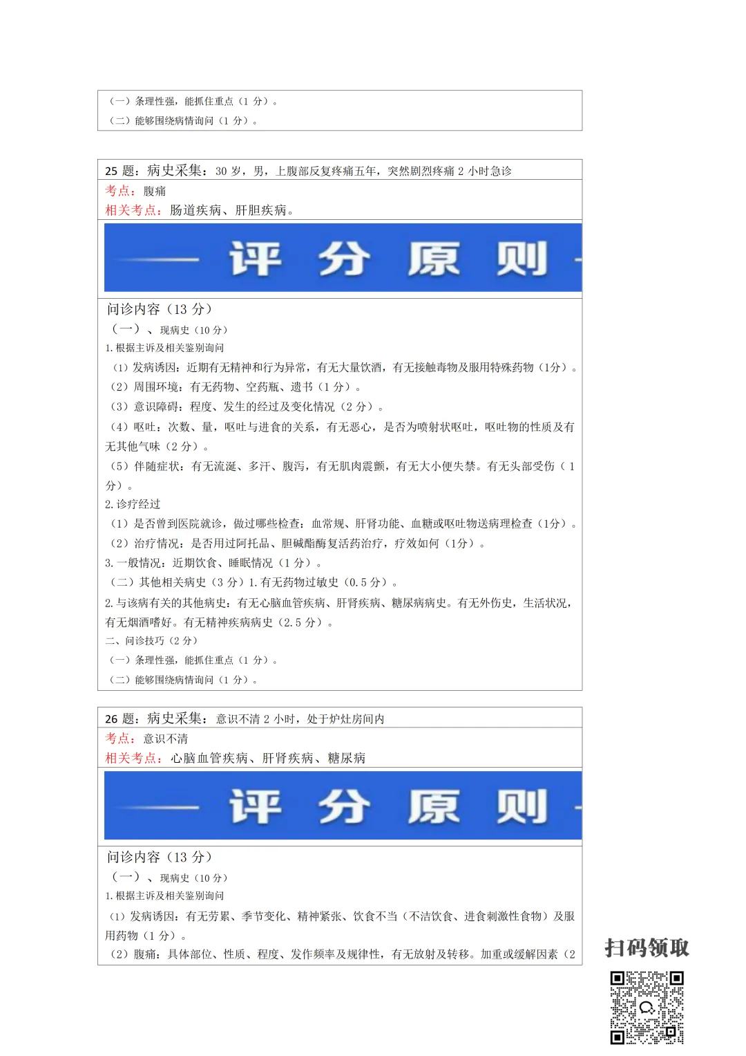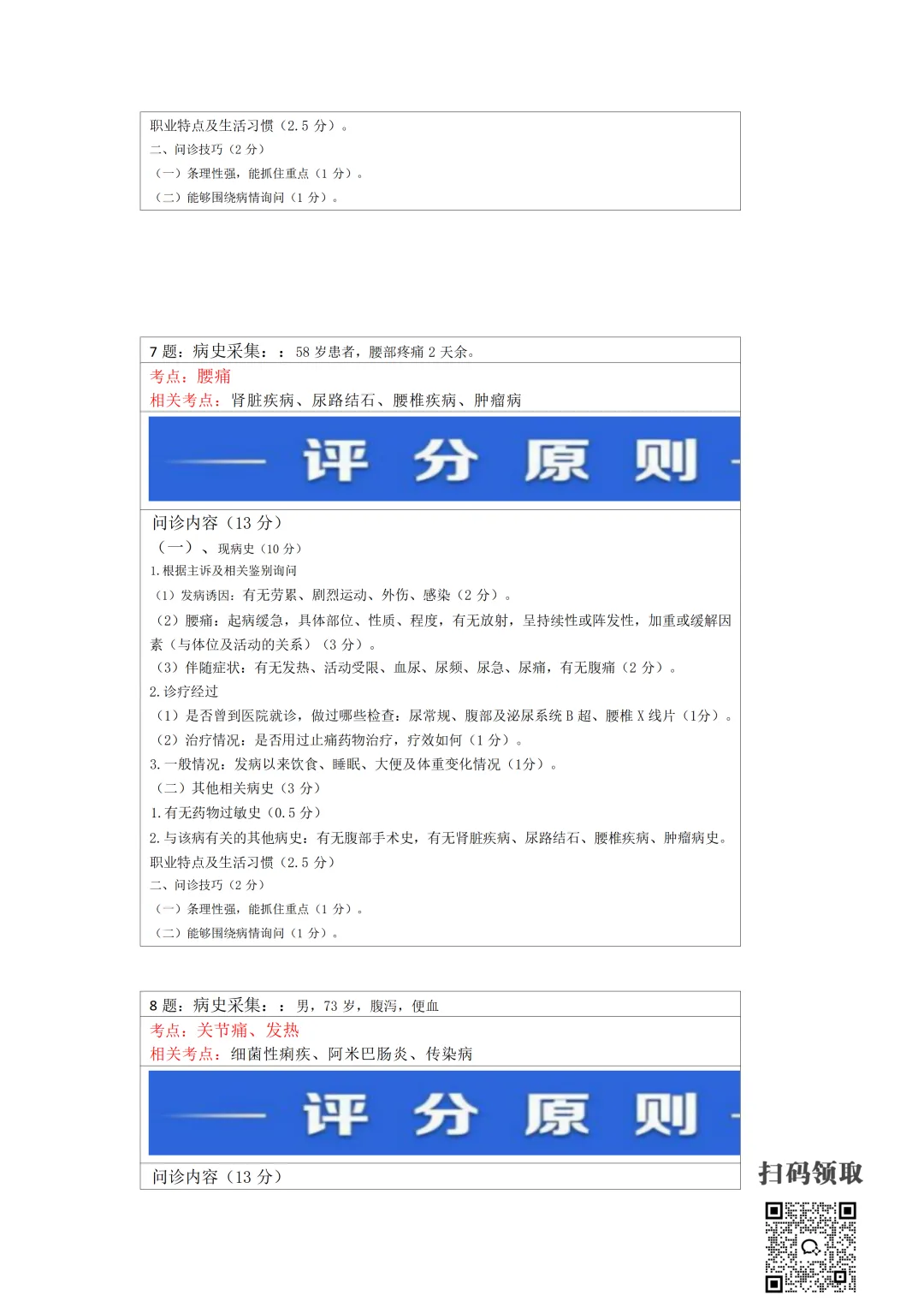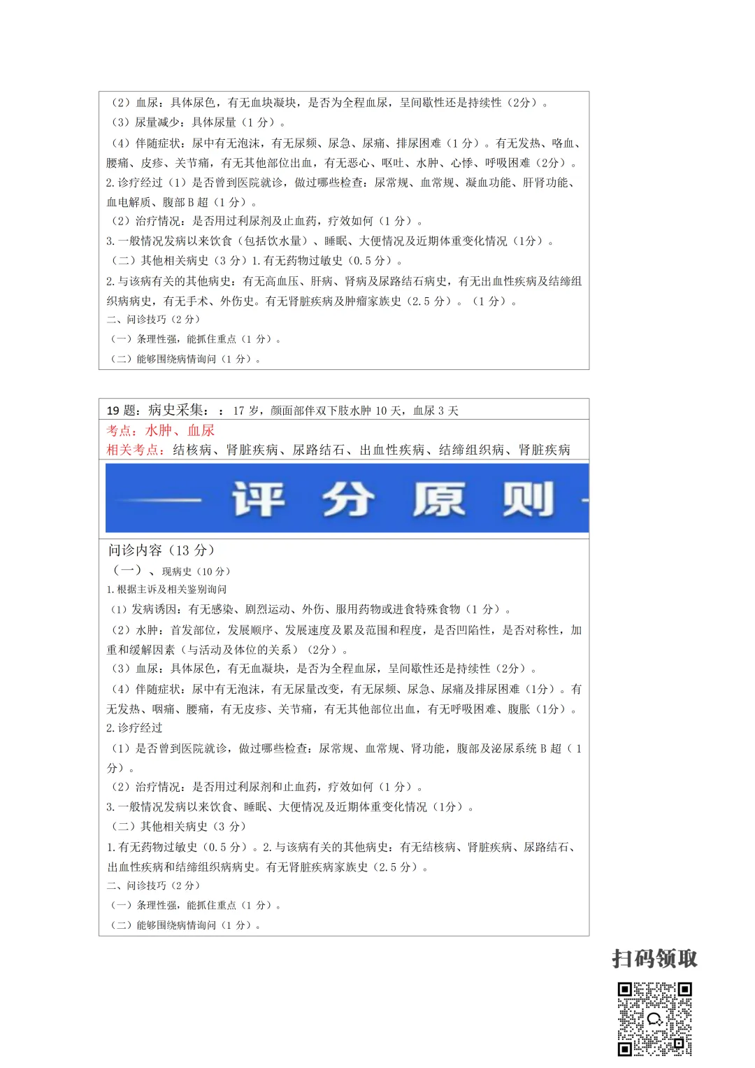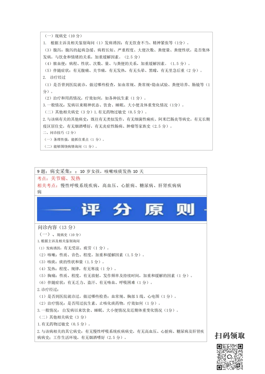 医师考试必备:病史采集万能公式(可打印) 执业医师实践技能考官手册 免费领取 (扫码领取) 病史采集万能公式及评分标准 领取方法 扫码领取 小程序领取 关注本公众号,获取完整版报考指南、考点及备考资料↓↓↓