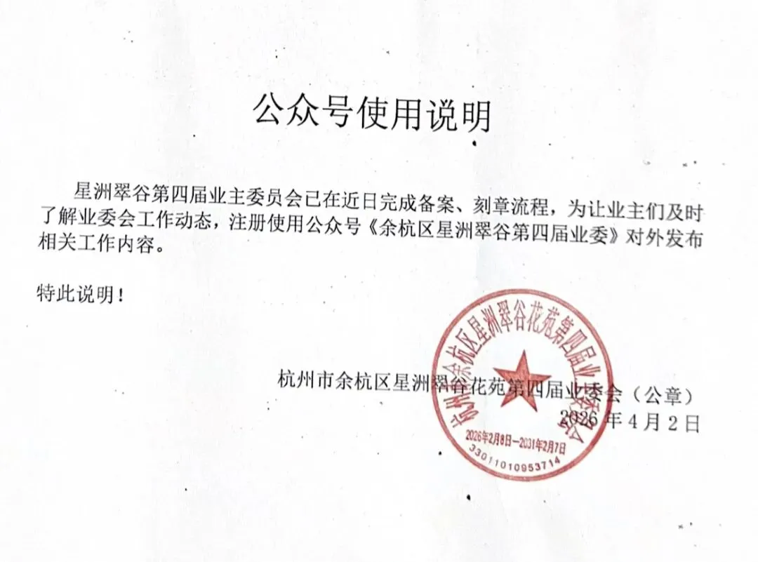 公众号使用说明 星洲翠⾕第四届业主委员会已在近⽇完 成备案 、刻章流程 为让业主们及时了解 业 委会⼯作动态,注册使⽤公众号《余杭区星 洲翠⾕第四届业委 》对外发布相关⼯作内容 。 特此说明 ! 杭州市余杭区星洲翠谷花苑业主委员会