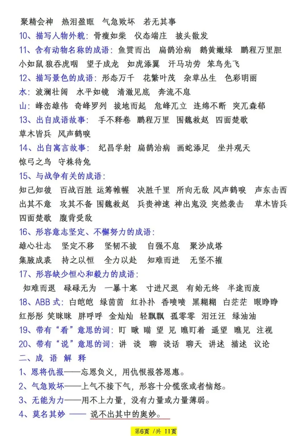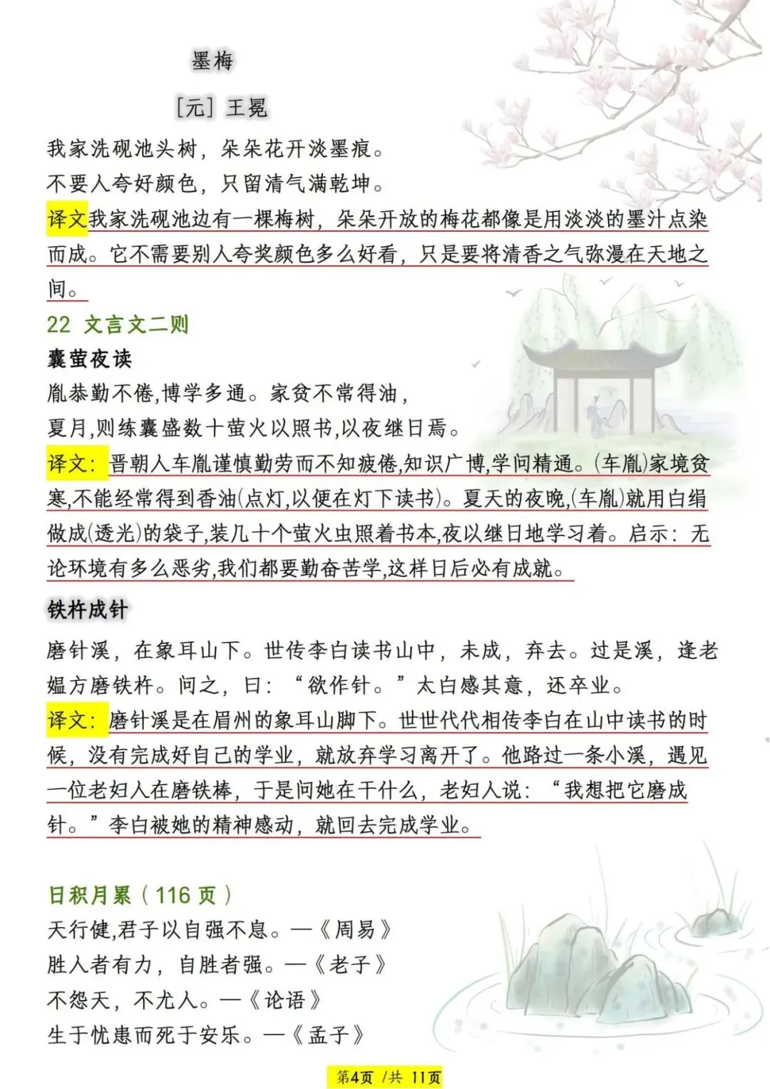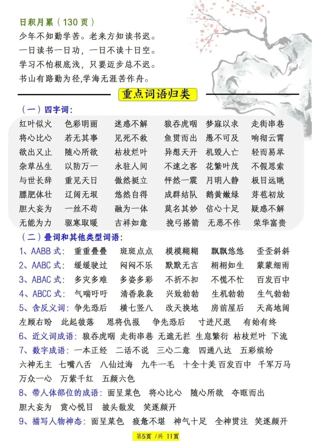本期分享:这份资料是四年级下册语文核心必背内容合集,全覆盖课本必考的古诗词、课文片段、日积月累名句,还收录文言文二则及详细译文,同时整理了重点词语归类、成语解析,以及课文人物品德和主旨情感总结。内容紧贴教材考点,标注清晰、解析详实,兼顾背诵与理解。