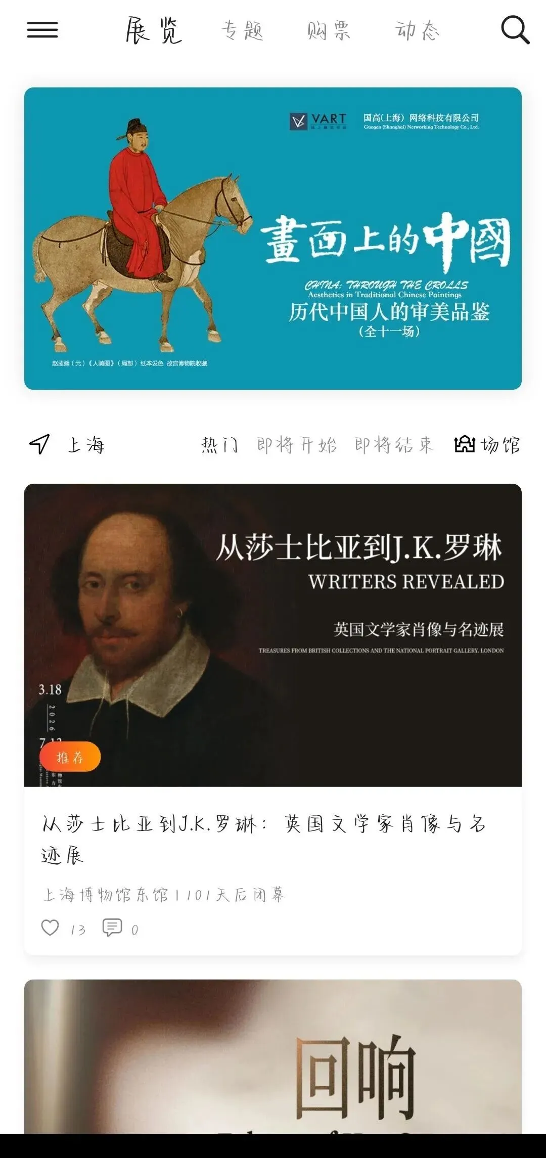 收录了全球博物馆、美术馆、画廊,可以非常方便的查询到你所在城市周边的一些展览,偏向正式的博物的展览,如国家博物馆、故宫博物院的展览等