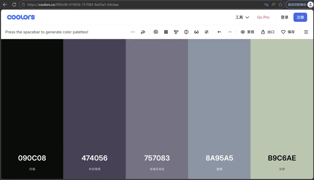 配色方案生成器,点空格就会生成不同的颜色,点击两个相邻的色块中间的+号还可以增加颜色,遇到喜欢的颜色可以锁定,再点击空格可以生成与此颜色搭配的其他颜色,可以看到每个色块的明度色阶、直接复制色彩编号