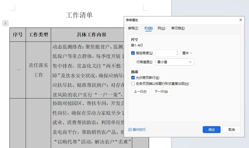 框选整个表格,点击鼠标右键,选择表格属性,选择行,勾选指定宽度,行高值选择最小值,确定,就完成了。这样表格就会根据文字的数量,自动调整好高度了