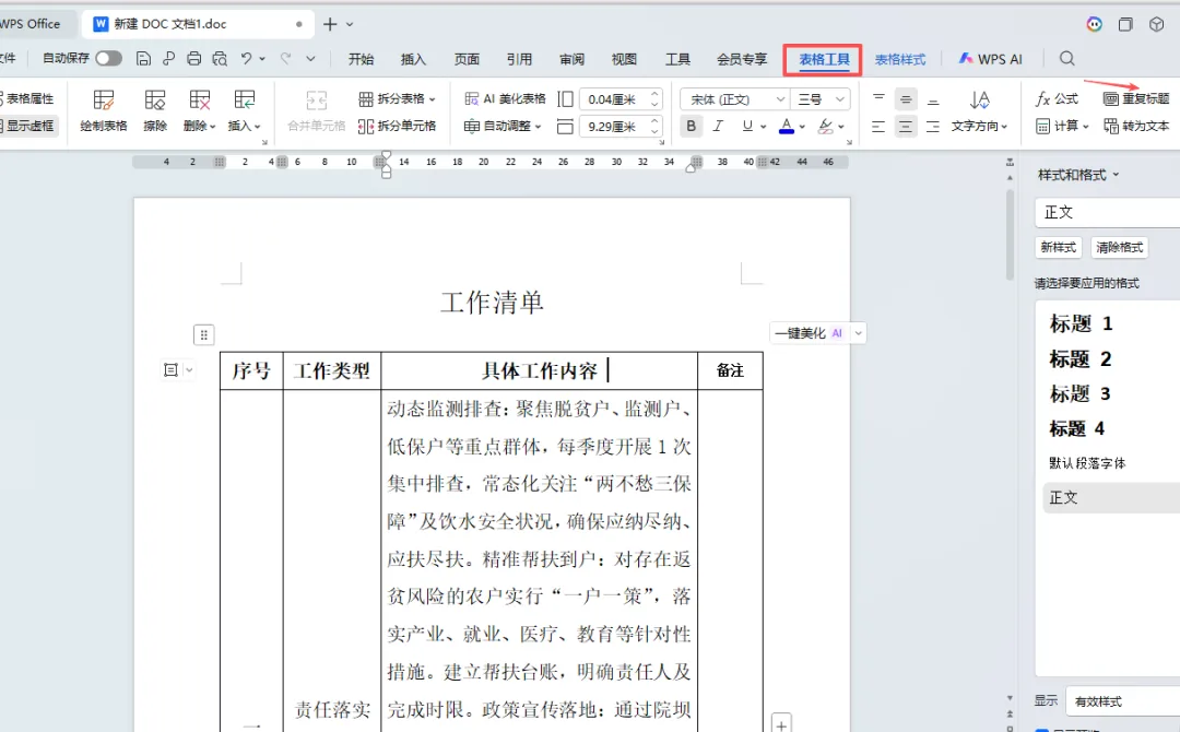 我们可以先把鼠标放到第一页有标题的位置里,找到表格工具,点击重复标题,这样每一页就都有标题了。