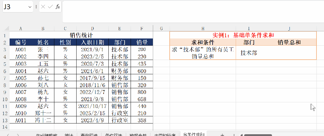如上图,求和区域仍然为销量列,条件1区域为部门列,筛选条件值为技术部;条件2区域为性别列,筛选条件为男。对满足这两个条件的销量进行求和。