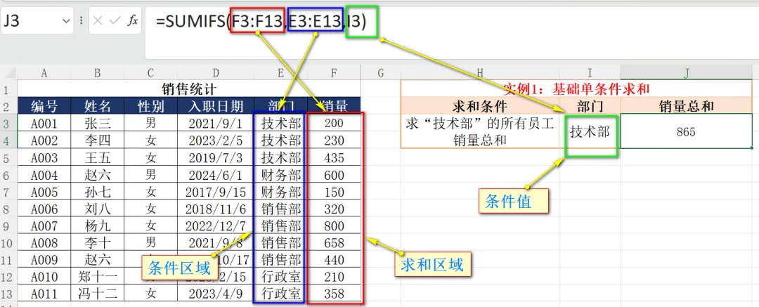 如上图所示,SUMIFS的第一个参数是就和区域F3:F13,即销量列;第二个参数为条件区域E3:E13,即部门列;第三个参数则是筛选条件值I3,即技术部。通过该公式即可求出“技术部”的所有员工销量总和,当我们更换部门时,公式便会求出相应部门的总销量。