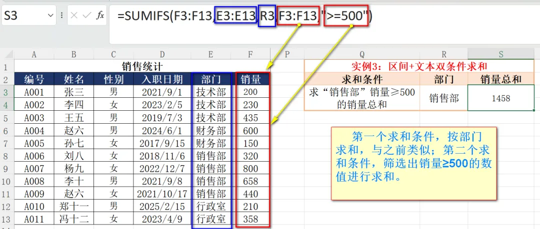 如上图,第一个求和条件,按部门求和,与之前类似;第二个求和条件,筛选出销量≥500的数值进行求和。
