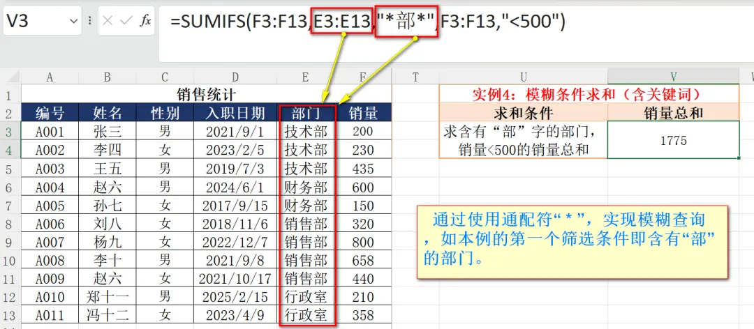 =SUMIFS(F3:F13,E3:E13,”*部*”,F3:F13,”<500″)