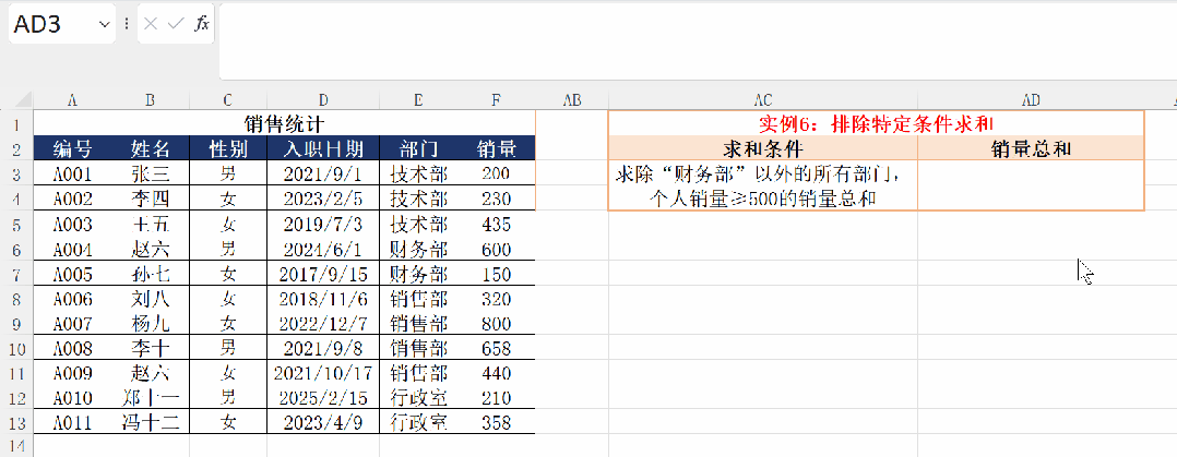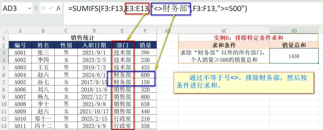 如上图,通过不等于号<>,排除财务部,然后按条件(个人销量≥500的销量)进行求和。