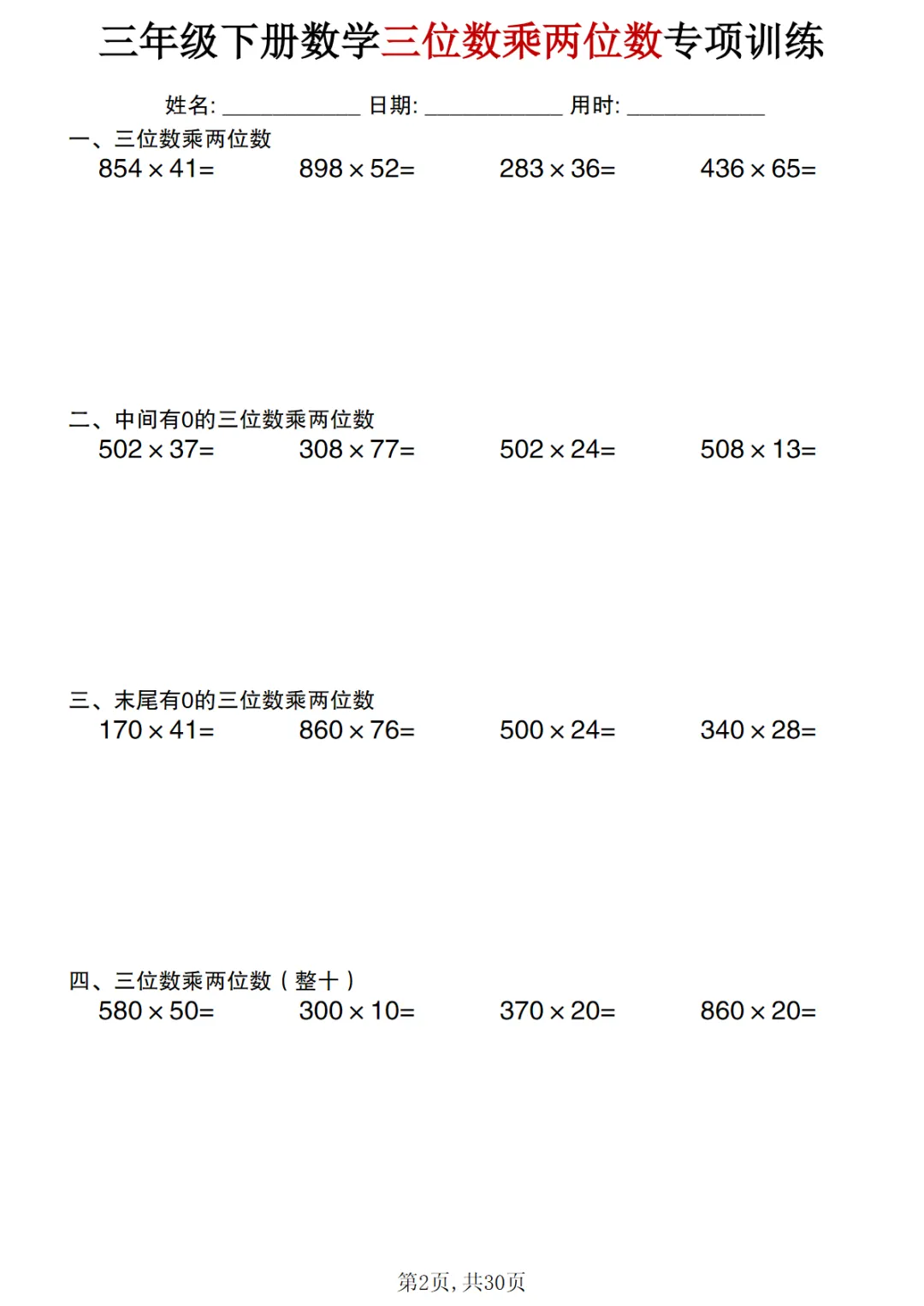 【免费下载】三年级(下)数学 三位数乘两位数专项训练,PDF电子版,可打印