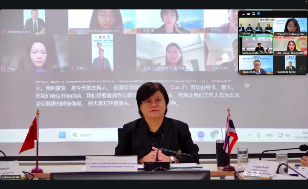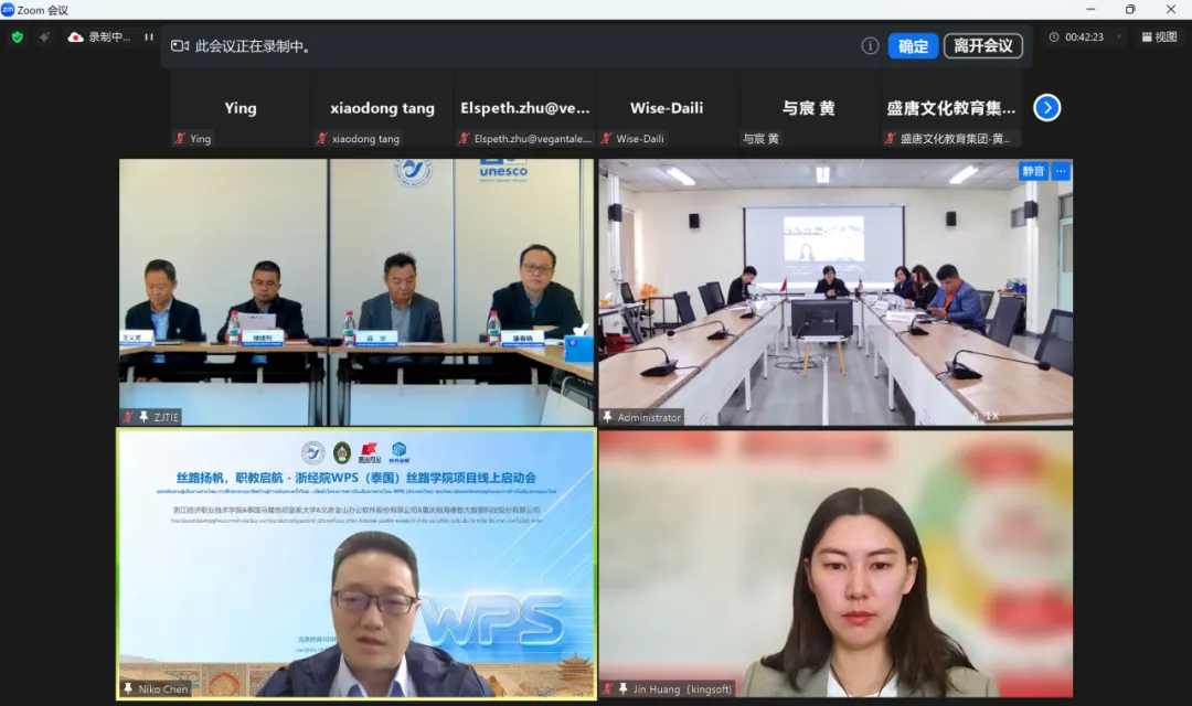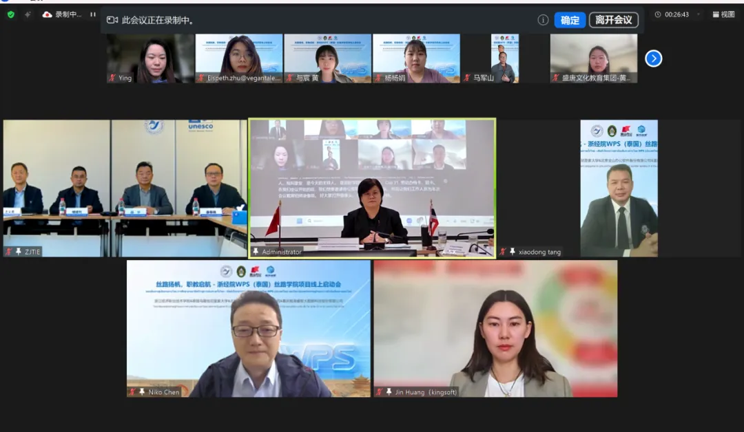 为深入贯彻落实国家关于职业教育高质量发展和“一带一路”建设的决策部署,主动服务职业教育“出海”战略,深化中泰职业教育领域务实合作,4月3日上午,我校联合泰国乌隆他尼皇家大学、北京金山办公软件股份有限公司、重庆翰海睿智大数据科技股份有限公司,以跨国线上视频会议形式,隆重召开“丝路扬帆,职教启航——浙经院WPS(泰国)丝路学院项目”启动会。来自中泰两国四方院校、企业的核心代表齐聚云端,共同见证项目正式启动。