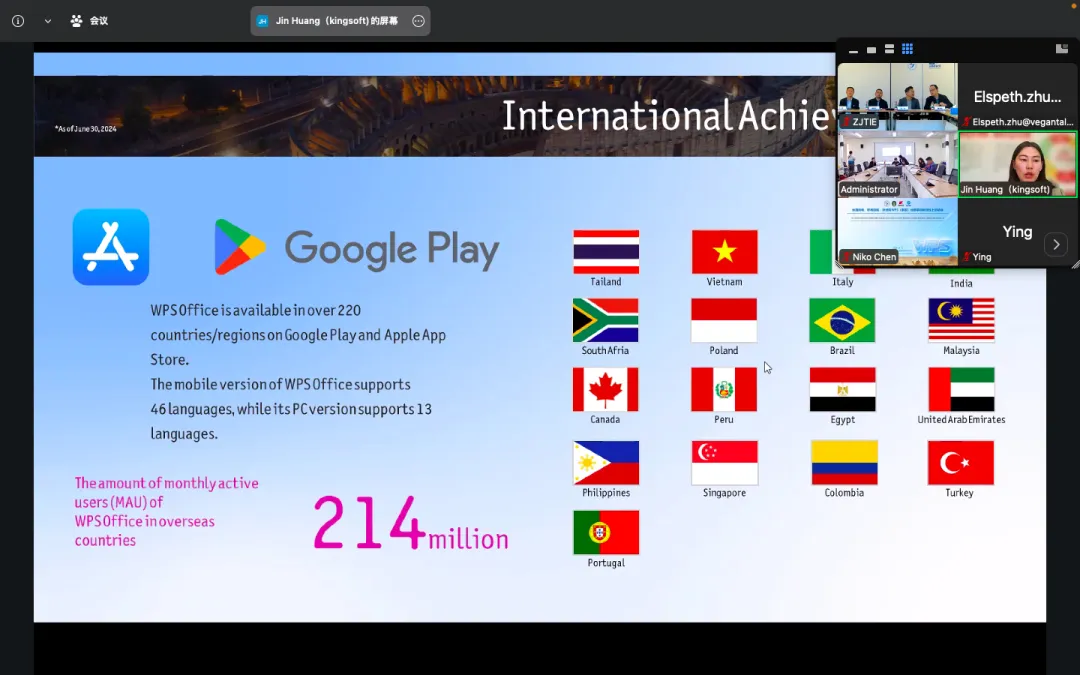 浙江经济职业技术学院党委委员、副校长聂华,数字技术学院院长楼建列,国际教育学院副院长、外事办副主任康春晓,数字技术学院大数据专业主任王义勇出席会议。泰国乌隆他尼皇家大学校长KhanisaraThanyasunthornsakun携国际学院核心管理团队代表参会。金山办公、翰海睿智相关负责人及项目核心团队成员参加会议。