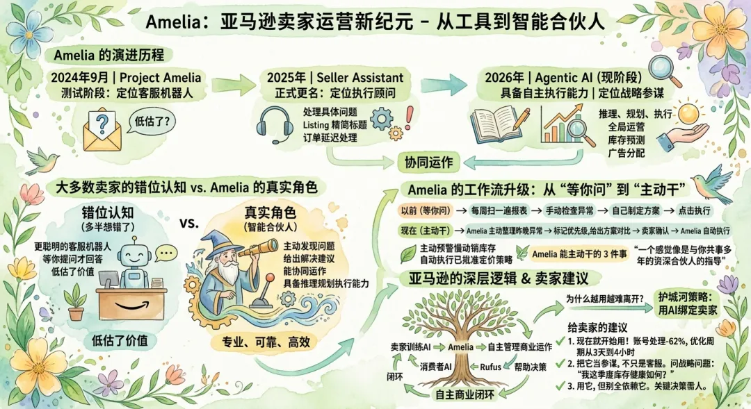 Amelia的发展历程是这样的:2024年9月以“Project Amelia”代号测试,2025年Amazon Accelerate大会正式更名为“Seller Assistant”,2026年进化成了具备自主执行能力的Agentic AI。